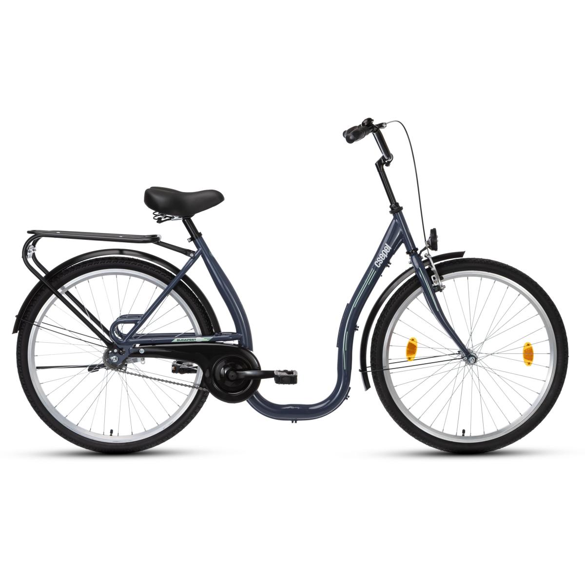 Stabil szerkezetű városi kerékpár Hölgyeknek/Uraknak, egy sebességes, kontrafékes, alacsony átlépésű kivitelben.
