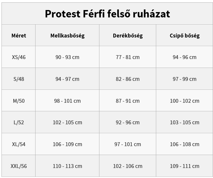 Méretek: S (48), M (50), L (52), XL (55)